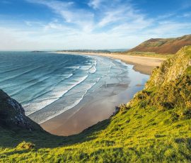 Śniadanie w hotelu. Przejazd do St Davids – najmniejszego miasta w Wielkiej Brytanii. St Davids reklamuje się jako ulubione miejsce artystów, podróżników, pielgrzymów i surferów, a jego główną atrakcją jest katedra św. Dawida. Średniowieczna katedra jest imponująca i jest najważniejszym miejscem kultu religijnego w całej Walii. Następnie odwiedzimy półwysep Gower, który słynie z rozległych wrzosowisk, wyjątkowo urodziwych, piaszczystych plaż oraz imponujących, wapiennych klifów. To pierwszy obszar w Wielkiej Brytanii, który został ogłoszony Obszarem Ochrony Krajobrazu. Zatrzymamy się przy malowniczej zatoce Rhossili, często uznawanej za jedną z najpiękniejszych plaż w Europie. W ostatnich latach półwysep zasłynął też dzięki słonecznikom. Stworzone przez organizacje National Trust kwiatowe pola przyciągają fanów fotografii. Dalsza część dnia to spacer wybrzeżem Pembrokeshire Coast, którego ponad 300-kilometrowa linia klifów oferuje zapierające dech widoki na Morze Irlandzkie. To miejsce, gdzie surowość natury spotyka się z jej niepowtarzalnym pięknem, tworząc idealne warunki do pieszych wędrówek, wspinaczki i fotografii. Odwiedzimy także Tenby z czterema pięknymi piaszczystymi plażami- miejscowość która jest wizytówką wybrzeża. Znajdziemy tu malowniczo usytuowane na zboczach klifu kolorowe budynki i położony poniżej zabytkowy, niewielki port w otoczeniu turkusowego morza. Przejazd do hotelu. Obiadokolacja i nocleg.